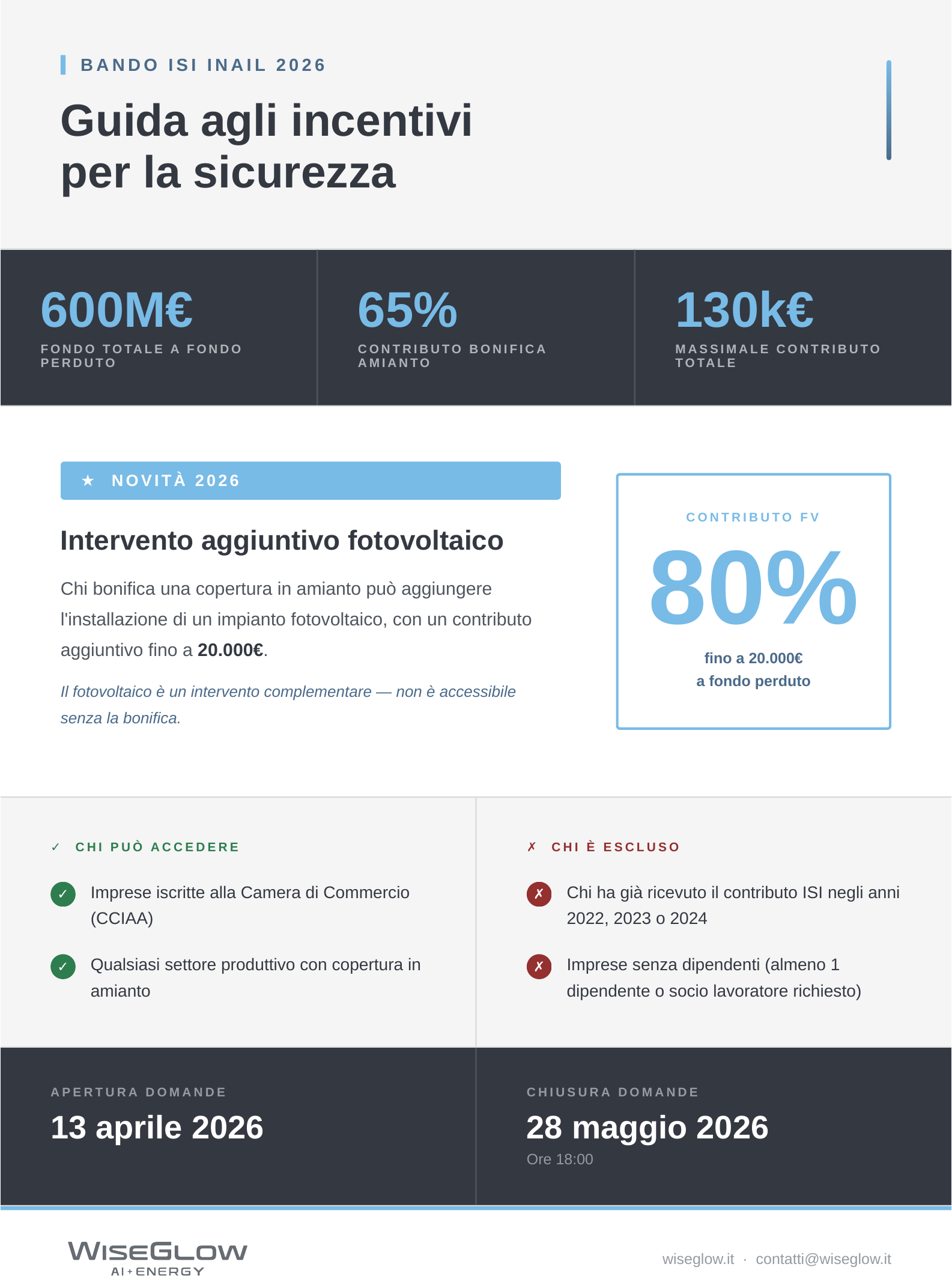 Il bando ISI INAIL 2026 mette a disposizione 600 milioni a fondo perduto. Scopri come abbinare la bonifica amianto all’installazione di un impianto fotovoltaico con il nuovo intervento aggiuntivo.